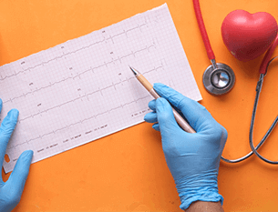 Vi sätter klisterelektroder på din bröstkorg, handleder och fotleder. Med hjälp av dem registrerar vi hjärtats elektriska aktivitet.